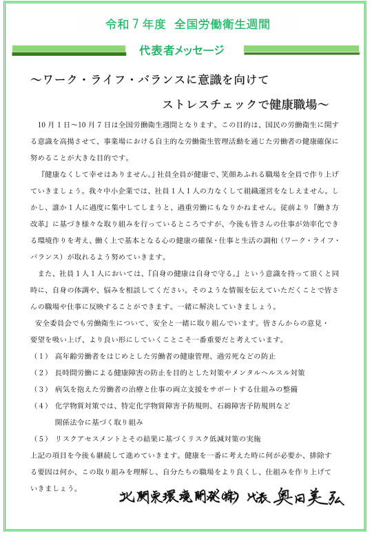 また、安全コンサルタントの橋爪先生に講話をしていただき昨年度よりもさらに安全への意識を高めることができました。